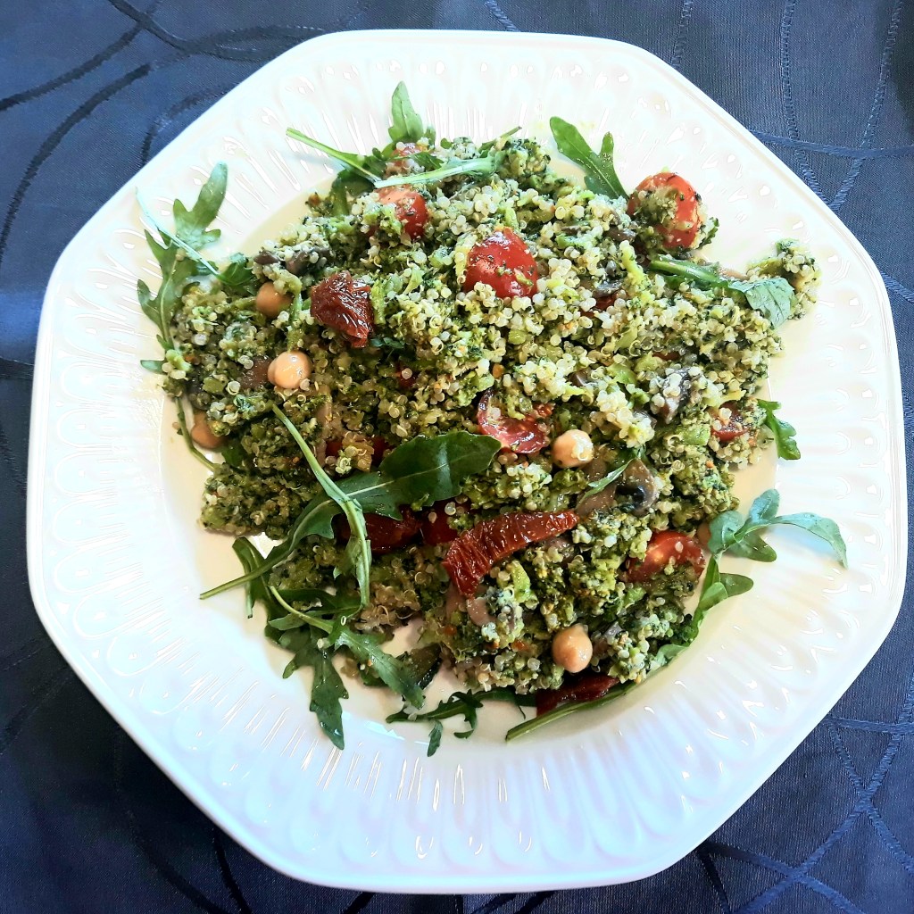 En un bol añadimos el brócoli, la quinoa, los champiñones, el pesto, unos tomates cherry partidos por la mitad y unos trocitos de tomate seco.