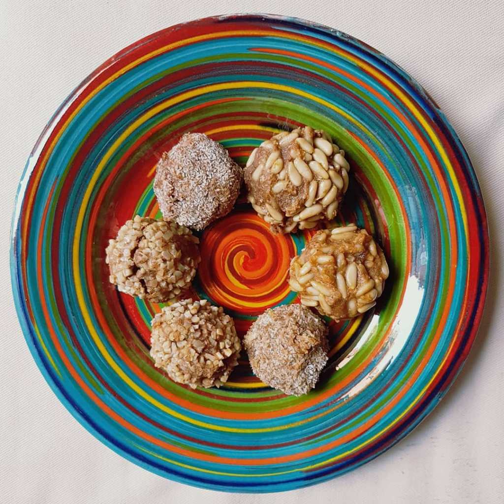Vamos haciendo bolitas pequeñas, las pasamos por huevo batido y luego las rebozamos en el ingrediente que queramos para decorar: piñones, almendra, coco rallado o café soluble.